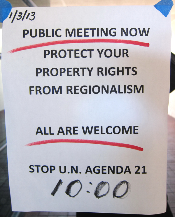 According to information handed out at Thursday’s meeting, opponents of Seven50 fear the regional planning initiative will lead to a step-by-step abolition of property rights, the indoctrination of youth to prepare them for global citizenship and ultimately control and reduction of the human population.