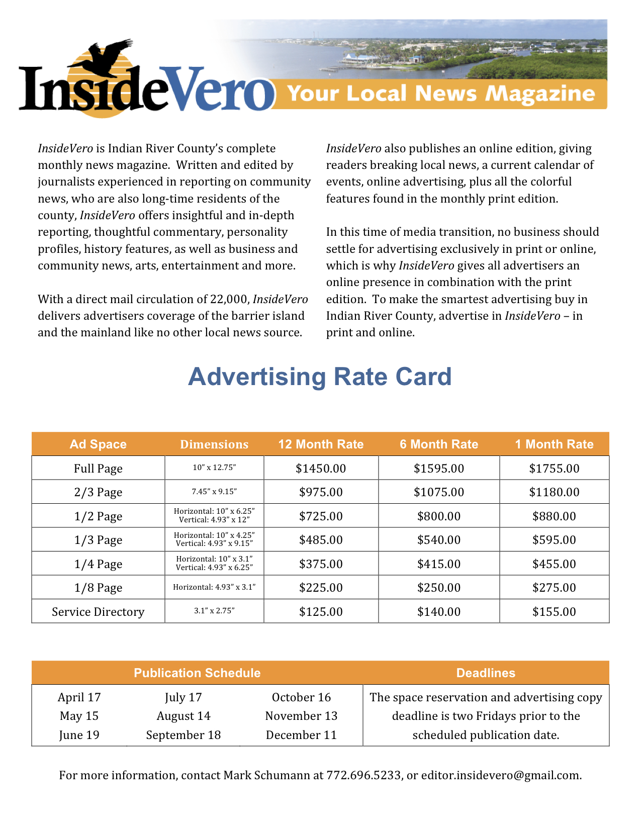 InsideVero’s first monthly print edition will be direct mail early next week to 22,000 households on the barrier island and the mainland south of Wabasso. An additional 2,000 copies available at local businesses.