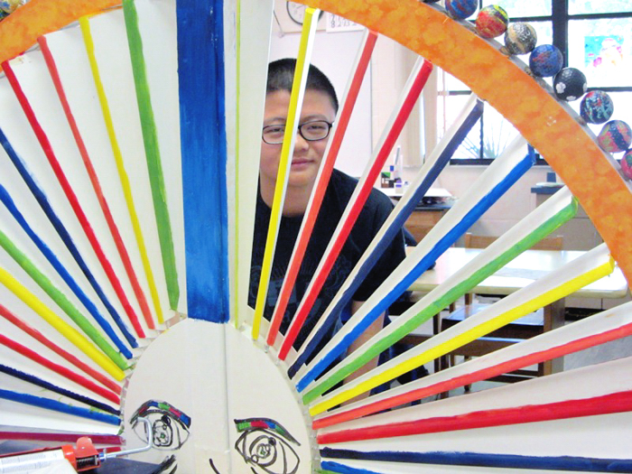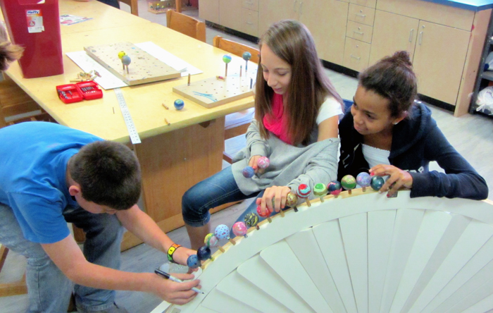 The clever project had its genesis when Monroe spotted Kornicks browsing in the Home Center. She noticed he had a lot – 20-30 – ceiling fan blades, and asked what he had in mind for so many. “How many ceiling fans could he have?” she wondered. As it turned out, Kornicks was seeking random materials for his art class to paint.