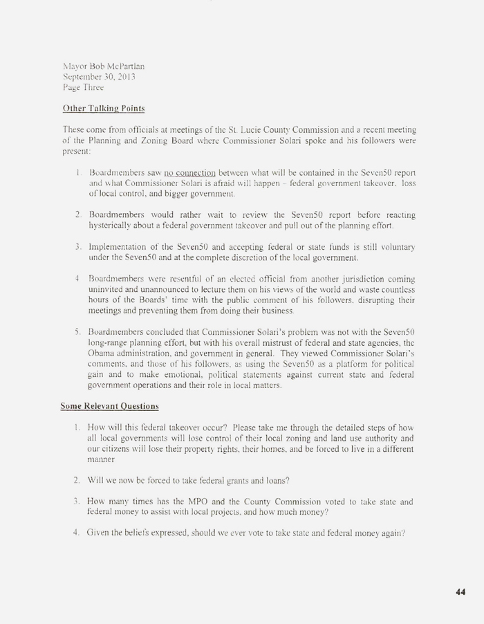 Solari led the County’s withdrawal from the Seven 50 regional planning effort, raising a number of objections, including the assertions that Seven 50 did not represent Indian River County’s core values and that it is a process largely controlled by the the federal government.