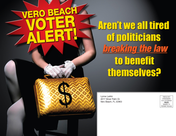 Challenging Tracy Carroll’s record, former Vero Beach City Councilwoman, Lynne Larkin, prepared and mailed a post card to likely voters this week. Larkin titled her mailing a “VERO BEACH VOTER ALERT!”