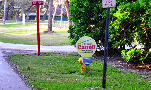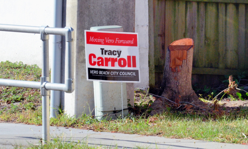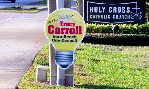 Yet another Carroll campaign sign grew up overnight in the right of way adjacent of property owned by the Indian River County School Board. If the School Board is endorsing Carroll, that is sure news to me. Even if Carroll had the School Board’s blessing, which she does not, it would still be illegal to place her sign in the right of way along Indian River Drive.