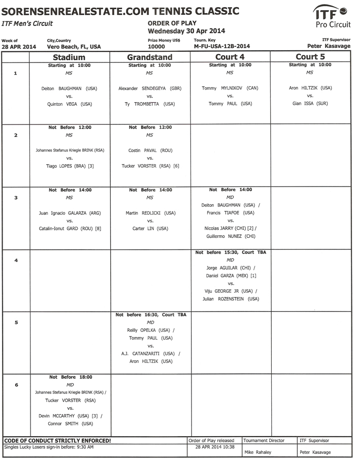 The main draw of the SorensenRealEstate.com Tennis Classic began today! Below are the results from Tuesday’s play, held at The Boulevard tennis complex in Vero Beach. The main draw continues today.