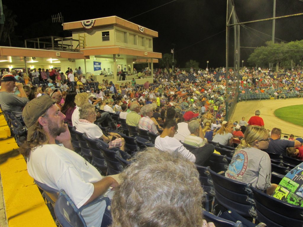 Over 4,000 spectators showed up to watch the Brevard County Manatees host the Lakeland Flying Tigers in spite of torrential rain as close as Sebastian and threatening storms. The weather over the stadium stayed dry, little leaguers marched around the field in uniform and stood with the professional players for the national anthem, Dodger Dogs were sold, there were raffles, contests, armbands and mascots. The lights came on to finish the game which was followed by a spectacular display of fireworks. It was everything you could want from Holman Stadium. This amazing experience was organized by committee chair Lynn Hall.