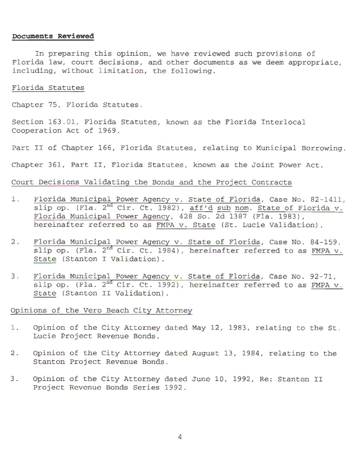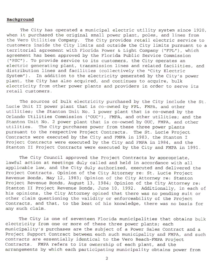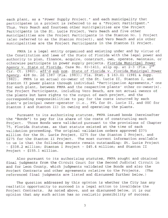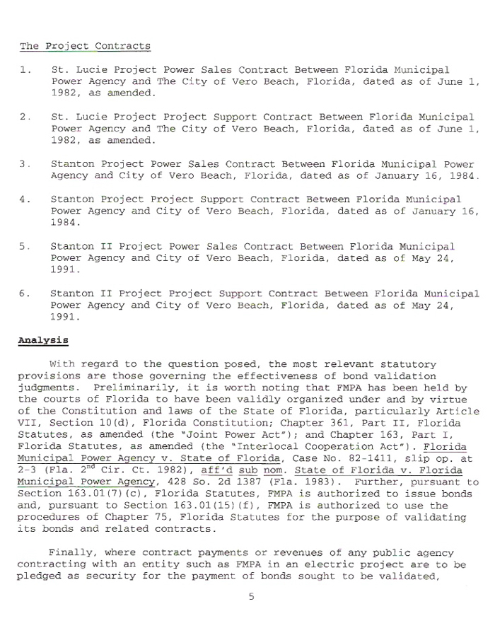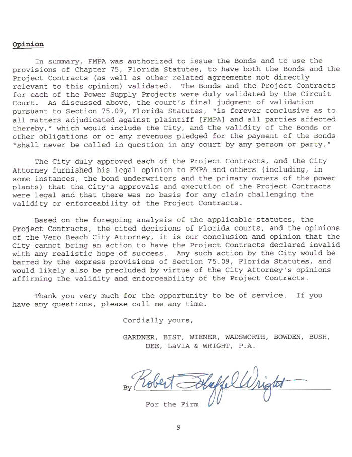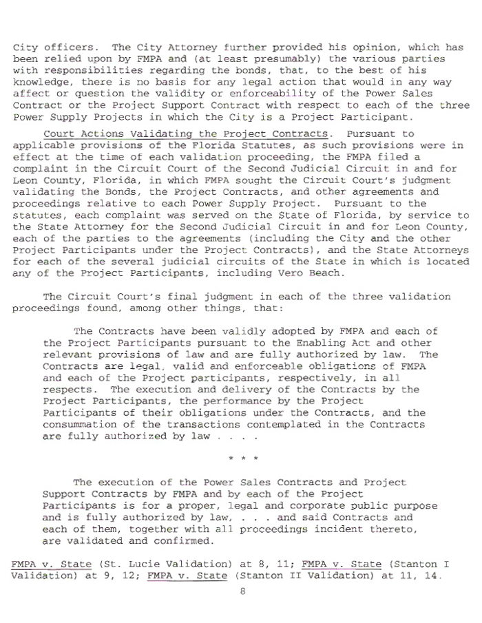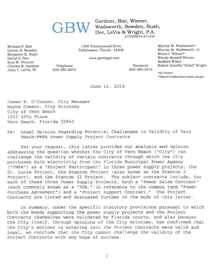 In a 9-page letter to City Manager Jim O’Connor and City Attorney Wayne Comment, Wright laid out in detail the history of the City’s power supply and project support contracts with the FMPA. Those contracts, Wright explained, were validated by the Florida Supreme Court in 1982, before bonds were sold to finance the projects. The court ruling validating the contracts protects bond investors and, as a consequence, also precludes any future challenges – by the City, by FPL, by the Indian River County Commission, by the Town of Indian River Shores, by local utility activists such as Glenn Heran, Dr. Stephen Faherty and Charlie Wilson, by anyone, period.