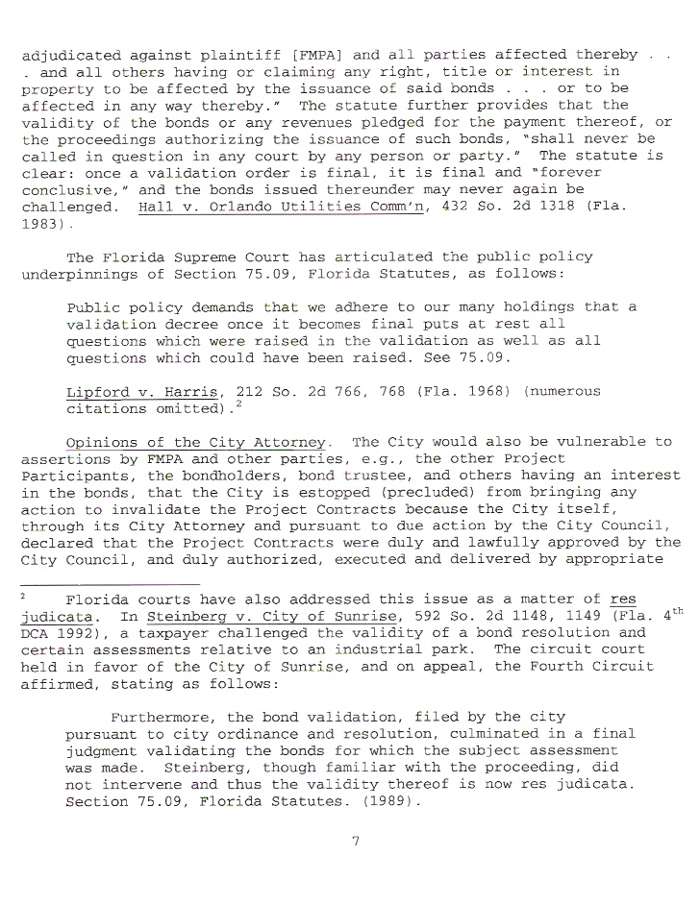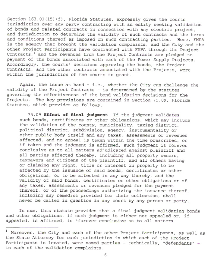 “…it is our conclusion and opinion that the City cannot bring an action to have the Project Contracts declared invalid with any realistic hope of success. Any such action by the City would be barred by the express provisions of Section 75.09, Florida Statutes…,” Wright explained.