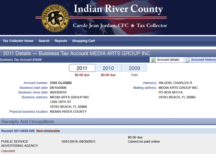 According the the latest information available on the Indian River County Property Appraiser’s website, Wilson’s business license for The Media Arts Group expired in 2009. Records in the City of Vero Beach Planning Department show that Wilson had a business license for The Media Arts Group, but the name on the license was changed in March 2011 to Asset Research and Recovery. That account is now inactive.