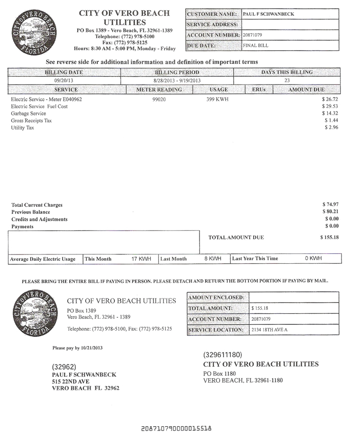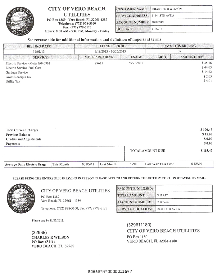 “In his letter to Vock, Wilson claimed the utilities were kept in his landlord’s name through Sept. 19 because that date was “the end of his billing period.” According to a spokesperson in Vero Electric’s customer service department, Wilson applied for service on Sept. 18. The spokesperson explained that because of a “move in” scheduled for Sept. 19, 2013, the billing cycle that began Aug. 28, 2013 was cut short on Sept. 19, rather than going through to late September. The typical meter reading dates for 2134 18th Ave, the spokesperson said, are between the 26th and the 29th of each month, not the 19th, as Wilson claimed.”