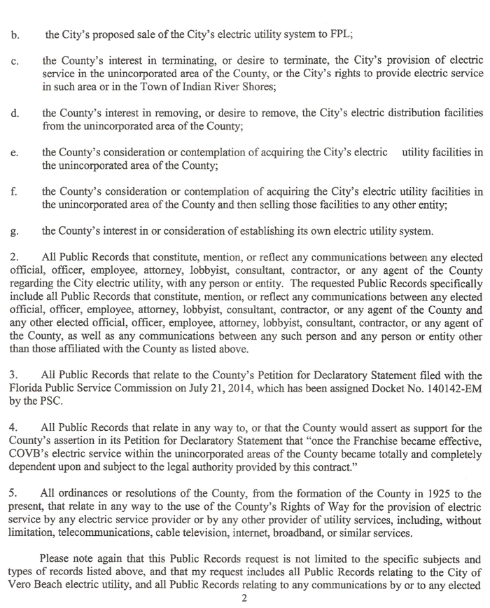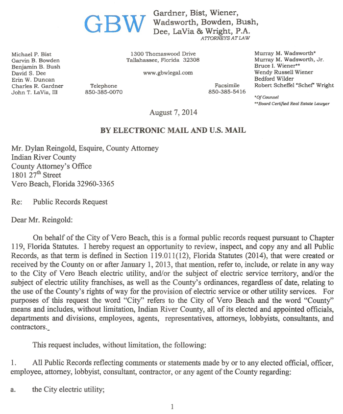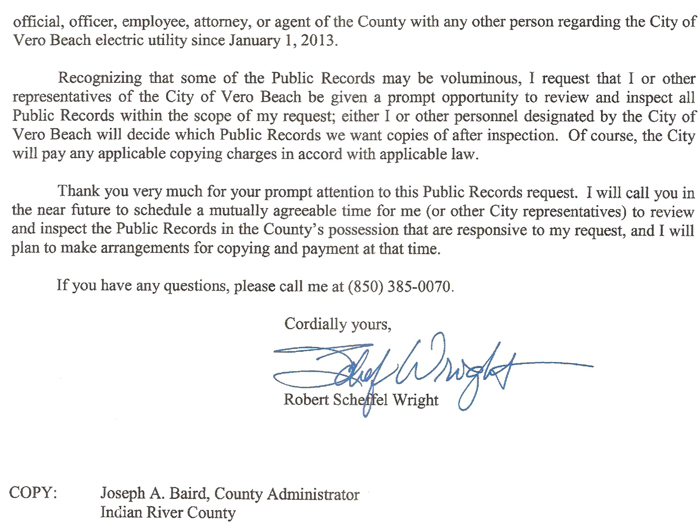 Late last week, Vero Beach’s special counsel, Schef Wright, sent Indian River County Attorney Dylan Reingold a board and expansive public records request. Wright asked for copies of documents and records of communications going back to January 1, 2013.