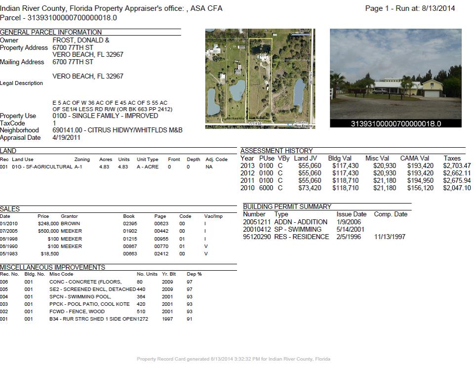 However, that address is not in District 1. It is in District 3. When he filed as a candidate for the Indian River County School Board with the Supervisor of Elections, Frost gave his residence address as 6700 77th Street. That property is owned by his father, Donald Frost. (Also below).