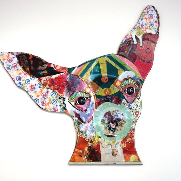 Originally from Miami, Gretchen developed an early love of Primitive Art, Folk Art, and Outsider Art, and spent over thirty years living and working in New York City. Through her association with the La MaMa Galleria, an Experimental Theatre and Gallery, she explored sculpture using tin cans, cookie tins, candy tins and soda and beer cans. The tins are assembled and then covered with a resin pour.