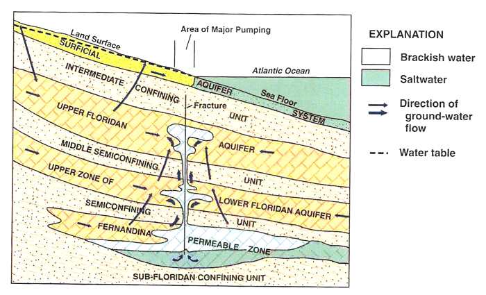 The risk to receiving water from the top Superficial aquifer is that it is easily affected by human activities, such a pollution from fertilizers and pesticides. The risk to receiving water from the Upper Floridan aquifer is that when water is withdrawn from it, it creates an opening for saltwater to intrude. Saltwater intrusion into the Upper Floridan aquifer can also flow up into the Superficial aquifer.