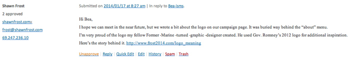 According to blogger, Bea Gardner, the comment came from the same IP address from which Frost wrote her in January. Both comments, presented below, were made from the IP address: 69.247.236.10.