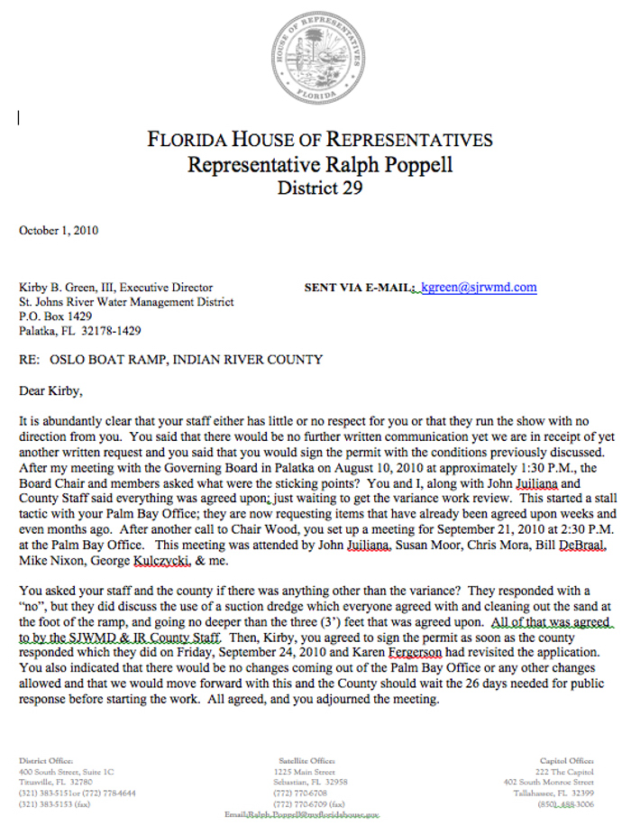 In 2010, as Chairman of the Florida House of Representatives Natural Resources Appropriations Committee, then Rep. Ralph Poppell, who owns Float-On Boat Trailers, wrote a harsh and sharply critical letter to Kirby Green, III, Executive Director of the St. Johns Water Management District. The SJWMD is the state agency responsible for reviewing and approving Indian River County’s proposed and now controversial Oslo Road boat ramp improvement project.
