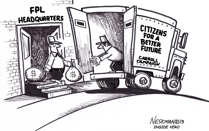 After investing some $125,000 in the spring of 2013 to persuade Vero Beach voters to sell their electric system, and after spending more than $40,000 last fall in a failed effort to re-elect Tracy Carroll, Florida Power & Light has now given half of the $18,000 raised by an electioneering communications organization supporting Harry Howle, III, Pilar Turner and Charlie Wilson.