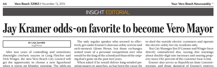 In a Nov. 13 “News Analysis” story drenched in her signature sarcasm, Vero Beach 32963 reporter Lisa Zahner advised the island weekly’s readers Jay Kramer was the “odds-on favorite” to become the next mayor of Vero Beach.