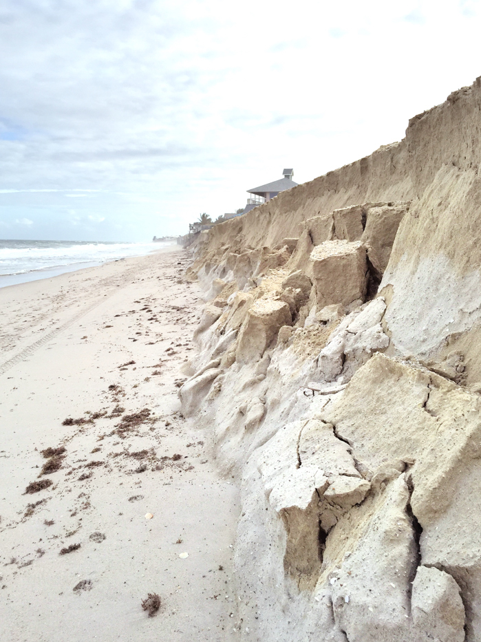 Currently, the County is paying contractors to truck sand from the inland mines to beaches in Summerplace and Orchid. Much of the sand – and shell and rock — has already washed away, leaving behind cliffs –not exactly the Cliffs of Dover, but cliffs just the same.