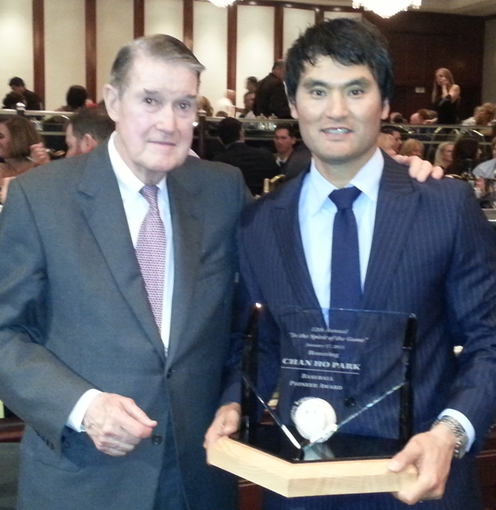 In 1994, Park became the first player from South Korea to sign a Major League Baseball contract. Upon signing with the Los Angeles Dodgers, Park has opened the door for 13 more players from South Korea to play in Major League Baseball up to date. Park went on to enjoy a successful professional career, posting a 124-98 record with a 4.36 ERA over 17 seasons. From 1994-2001 Park played with the Dodgers, earning All-Star honors in 2001 after posting a 15-11 record with 3.50 ERA. He then went on to play for the Texas Rangers, San Diego Padres, New York Mets, Philadelphia Phillies, New York Yankees and Pittsburgh Pirates. In 2010 while with the Pirates, Park picked up his 124th victory, passing fellow award recipient, Hideo Nomo, as the pitcher with the most wins by an Asian-born player. Currently, there are three South-Korean born MLB players, including Rangers outfielder Shin-Soo Choo and Dodger pitcher Hyun-Jin Ryu.