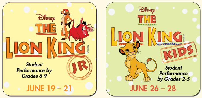 Disney’s The Lion King Junior, a full version of the Broadway show, performs June 19–21 and The Lion King Kids, an abridged hour-long version, performs June 26-28.