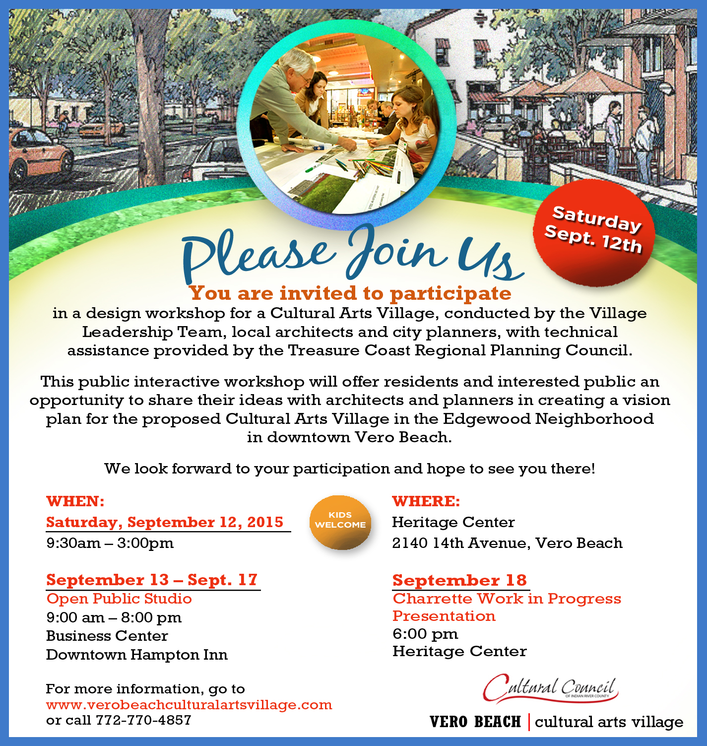 The Cultural Council of Indian River County and its Cultural Arts Village Leadership Team invites the public to provide input into the design of the proposed Vero Beach Cultural Arts Village through a design workshop, or charrette, to be held at the Heritage Center, 2140 14th Avenue in Vero Beach on Saturday, September 12th, from 9:30 am to 3:00 pm. This workshop will be conducted by the Leadership Team, local architects and city planners, with technical assistance provided by the Treasure Coast Regional Planning Council.