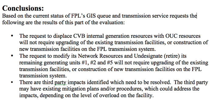 FPL’s system impact study, released September 30, confirms there is enough intrastate transmission capacity to easily deliver from the OUC to Vero Beach enough power to allow for the decommissioning of Big Blue.