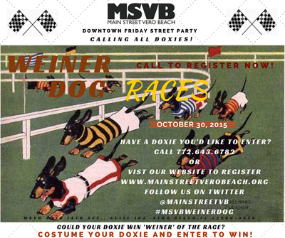 Main Street Vero Beach’s “Halloween” Downtown Friday will be held on October 30th from 6 to 9 pm on 14th Avenue. There will be Wiener Dog races, a pumpkin carving contest and costume contest for children and adults. Bring the family, enjoy the food and stay for the street party, dancing with music by Category 5. For more information or to register for the race or become a vendor, call 772-643-6782 or e-mail info@mainstreetverobeach.org.