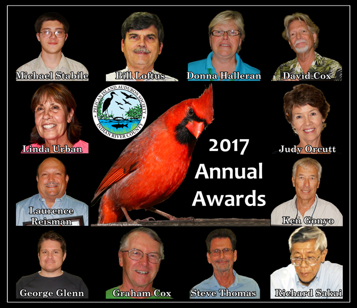 Many folks have volunteered and contributed to the success of our chapter by developing courses, leading and organizing birding field trips, writing grants for funding, maintaining our the Audubon House, initiating special events, and yes contributing money to keep projects going. At our annual meeting on March 20, 2017, we recognized the outstanding contributions individuals have made not only to our chapter but to our community. These awards highlight our activities and inspire us all to work together to improve our quality of life and make Indian River County a sustainable, environmentally, and happy place to live.