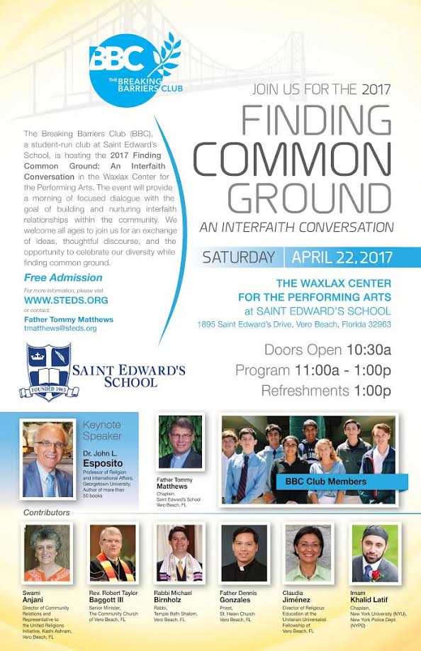 Although this is short notice, an important discussion will be held at St. Edward’s School this Saturday, April 22 from 11:00 a.m. until 1:00 p.m. in the Waxlax Center for the Performing Arts. The keynote speaker will be Dr. John L. Esposito, Georgetown University Professor of Religion and International Affairs. Representatives from the local faith community will also contribute. The event is sponsored by the Breaking Barriers Club, a student-run club at the school.