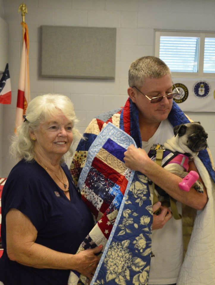 To wrap-up the afternoon everyone gathered in the Training Center for desserts and more celebration. Devon Williams with Quilt of Valor presented a beautiful custom made quilt to Jim Taylor, US Army (Ret.) and a smaller version to his service dog PiaPia. Shelly Ferger presented well deserved awards. She stated, “Dogs For Life can never say just how much we appreciate our donors and volunteers or how proud we are of our service dog team graduates.”