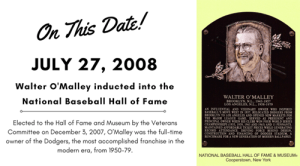 On this date in 2008, the National Baseball Hall of Fame holds its Induction Ceremonies in Cooperstown, New York, as Dodger owner Walter O’Malley is one of the inductees in the “Class of 2008.” Elected to the Hall of Fame by the Veterans Committee on December 3, 2007, O’Malley was the full-time owner of the Dodgers, the most accomplished franchise in the modern era, from 1950-79.