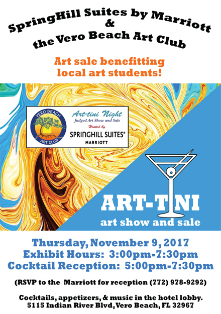 The Vero Beach Art Club presents Art-tini, an art show and sale, on Thursday, November 9 from 3 to 7:30 pm with a reception from 5 to 7:30 pm in the lobby at Springhill Suites by Mariott, 5115 Indian River Boulevard in Vero Beach. RSVP to 772-978-9292.