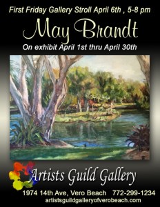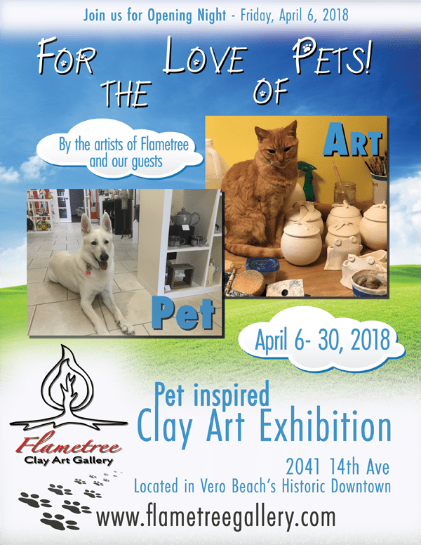 The First Friday Gallery Stroll in downtown Vero Beach will be held on April 6 from 5 to 8 pm. Here’ a preview of the gallery exhibits: Gallery 14 presents Guest Artist Photographer Paul Solovay showing his popular music series, glimpses of NYC, classic cars, European paintings with a new twist, and homage to Andy Warhol; a potpourri of fascinating, colorful work. The Artists Guild Gallery’s guest artist is May Brandt. Main Street Vero Beach exhibits paintings of Stephen Holloway. Flametree Clay Art Gallery is featuring works with the theme For the Love of Pets.
