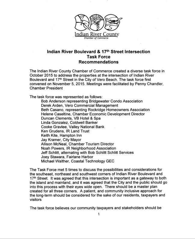 Editor’s note: Following are the recommendations of the Indian River County Chamber of Commerce task force formed to make suggestions and recommendation on how the community should proceed in deciding on how best to make use of the power plant and wast water treatment sites located north and south of the Alma Lee Loy Bridge. In short, the task force recommended, “…the community taxpayers and stakeholders should be included in a professionally led master planning process.” No where in their report did the Chamber’s task force recommend handing the decision over two three Council members whose seats were, for all intents and purposes, purchased by outside interests. Following is the full text of the final report issues by the Chamber’s 17th Street Intersection Task Force.