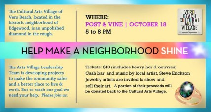 Enjoy an evening out at the Post & Vine, 1919 14th Avenue in Vero Beach and support the Cultural Arts Village on Thursday, October 18 from 5 to 8 pm. Enjoy heavy hors d’oeuvres and visit artisans who create jewelry tht will be offered for sale to benefit the Village. There will be a cash bar and entertainment by Steve Erickson. For tickets, $40, visit VeroBeachCulturalArtsVillage.com