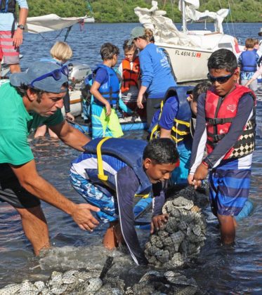 Over 75 sailors from Youth Sailing Foundation have been working with the Ocean Research & Conservation Association to build “living shorelines” in the Indian River Lagoon. Using fossilized shells to construct breakwaters parallel to the lagoon shoreline, the student sailors – 4th through 12th graders representing more than six area schools – are making real world physical improvements that will help preserve and improve the water quality of the Indian River Lagoon. According to internationally renowned marine scientist and ORCA founder Dr. Edie Widder, “The breakwaters play an important role in living shorelines as they help with erosion issues, slow the intrusion of muck and storm water, and provide essential hard surface for a variety of sheltered and attached organisms.”