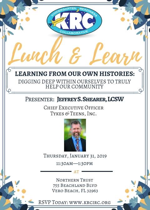 On Thursday January 31st at the Northern Trust Bank Bldg on Beachland Blvd., the Kindergarten Readiness Collaborative presents Teens & Tykes Director Jeffrey Shearer with a Lunch & Learn, “Learning From our Own Histories” from 11:30am to 1:30pm.