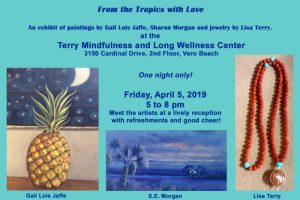 Three local artists will present their works at a one night only show on Friday, April 5th at the Terry Mindfulness and Long Wellness Center, 3150 Cardinal Drive, Second Floor, in Vero Beach. The public is invited to attend the “From the Tropics with Love” exhibit/reception to meet the artists and view original paintings and creative, casual jewelry from 5 to 8 pm. Gail Lois Jaffe will present watercolor and mixed media paintings, Sharon Morgan will be showing tropical-themed surreal acrylic landscapes and Lisa Terry will be presenting her spiritual prayer beads. Refreshments will be served. Join us for an evening of art, lighthearted conversation and creative camaraderie in a lively atmosphere.