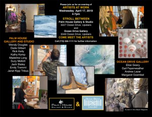 Stroll between two galleries on Wednesday, April 17 from 4 to 7 pm to see Artists at Work. Enjoy demonstrations and nibbles at Ocean Drive Gallery, 3227 Ocean Drive (Upstairs) and Palm House Gallery, 3349 Ocean Drive, Upstairs.