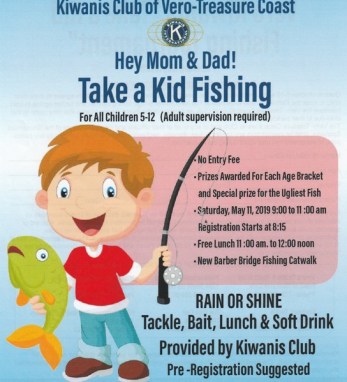 The Kiwanis Club of Vero-Treasure Coast announces its 28th annual “Take a Kid Fishing” Tournament on Saturday, May 11 for all children ages 5-12. Entry in the fishing contest is free. Rods and reels will be provided to those who do not have equipment of their own. Bait is provided for participant.