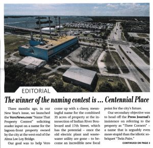 While I am sure Vero Beach residents appreciate the efforts of his “90 or so local residents” to come up with a name he believes Indian River Shores residents would approve of, it should be noted that ultimately the citizens and City Council of Vero Beach are responsible for making that decision, not an editor and his neighbors north of town.