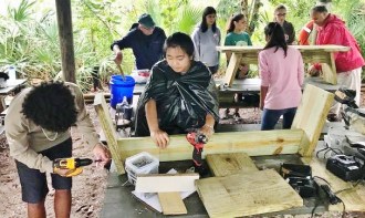 In the pouring rain about 60 members of the Kiwanis Youth in Action team gathered at 8:00 a.m. in the ELC under the direction of Kiwanis members and volunteers. One large crew used power tools to build 20 visitor convenience benches for distribution around the ELC grounds. Smaller crews painted two event rooms, built work benches for kids, and knocked down an old brick structure. The initiating event for this KYIA project was a presentation by Barbara Ford, executive director of the Environmental Learning Center, to the Kiwanis Club of Vero-Treasure Coast about the ELC and areas in which it needs community support.