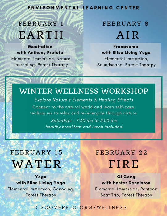 Our Wellness Workshops guide you through the process of reconnecting to nature to find yourself. You will learn self-care techniques to relax and re-energize through our natural environment. A community of like-minded individuals and new friends awaits you here at the ELC! Workshops are held on each Saturday for one month. Join us for one or all four.