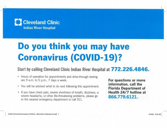 Do you think you may have the COVID-19 coronavirus? Call Cleveland Clinic Indian River Hospital at 772-226-4846