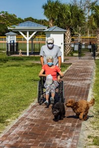 “We knew many senior citizens had dogs all their lives and now missed their companionship” said Joy. “We communicated with local assisted living facilities and saw our first bus of seniors arrive mid-June of 2019. Those folks enjoyed watching all the dogs at play from the entry area outside the fence. Our most recent paved walkway project provides safer access to the pavilion once inside the park” said Joy.