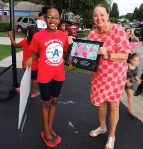 Jeanne Perry, a fifth grader from Dodgertown Elementary in Vero Beach, was awarded the Indian River County Kids Tag Art medal Wednesday (May 27) in ceremonies outside her home. County Tax Collector Carol Jean Jordan presented the award during the “Kids Tag Art- Indian River Inc Drive-by Awards Ceremony”.