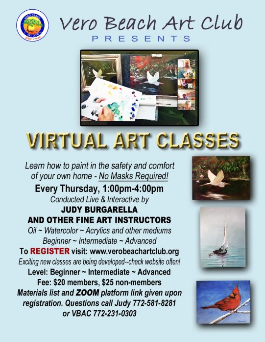 The Vero Beach Art Club presents Virtual Art Classes every Thursday, 1:00 pm to 4:00 pm through the Zoom platform. Populare teacher Judy Burgarella along with other fine instructors will be teaching a variety of mediums and subjects. Students can paint along in the safety and comfort of their own homes. Class fee is $20 for members, $25 for non-members. Register on-line at www.verobeachartclub.org, or call the VBAC at 231-0303, or Judy Burgarella at 772-581-8281, judithburgarella.com