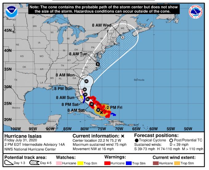 Hurricane Isaias is a Category 1 hurricane with winds of 75 mph and about 245 miles SE of Nassau, Bahamas. Hurricane Isaias is moving NW across the Bahamas today and tonight, then moving north very close to the Florida east coast over the weekend. The forecast brings Isaias just offshore east central Florida this weekend. Hurricane force winds are not expected in Indian River County. A Hurricane Watch has been issued along the east coast from north of Deerfield Beach to the Volusia/Brevard County line.A Tropical Storm Warning has been issued from north of Ocean reef to Sebastian Inlet and for Lake Okeechobee.Indian River County is NOT planning to open any public shelters, or close bridges to the barrier island.Suggested Protective Actions: