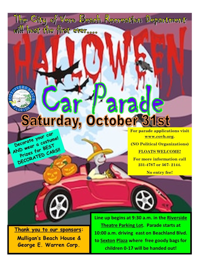 Halloween lovers – we have the perfect event for you! Participate in the City of Vero Beach Recreation Department’s FIRST EVER Halloween Car Parade! Wear your costumes and decorate your car or a float and meet us in the Riverside Theater parking lot at 9:30 a.m. on October 31st – Halloween! The parade will begin at 10:00 a.m. driving east on Beachland Blvd. to Sexton Plaza where free goody bags for participants ages 0 – 17 and prizes for best decorated vehicles will be handed out by our awesome Recreation Staff! Don’t forget to stop by Mulligan’s for breakfast! No walkers or political organizations will be permitted. Please call Gaby Dwyer, parade supervisor at 231-4787 or 567-2144 for details. Visit the recreation page at www.covb.org for parade application and flyer.