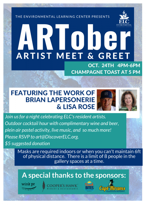 ARTober The Environmental Learning Center (ELC) and guests will rejoice by featuring artists who have exhibited at the ELC both past and present. Meet & Greet October 24, 4 – 6pm. Please email art@DiscoverELC.org to RSVP