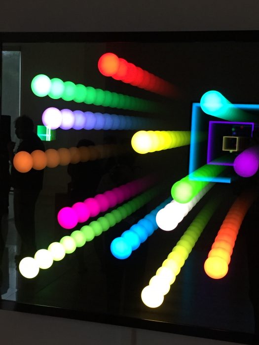 The rest of his exhibition is comprised of color-rich, neon-like, geometric shapes that change color as you stand to view them. He creates the look and feel of neon using LEDs, the feeling of depth using, well, you must see it to believe it.